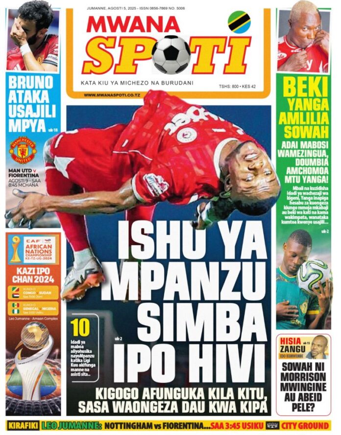 HomeMAGAZETI YA LEOMAGAZETI YA MICHEZO LEO JUMANNE TAREHE 5-8-2025 MAGAZETI YA LEO MAGAZETI YA MICHEZO LEO JUMANNE TAREHE 5-8-2025 By Chikao August 5, 2025 0 578 Share FacebookTwitterPinterestWhatsApp Habari mwanafamilia wa SokaLeo Pitia Kurasa za Magazeti ya michezo leo ya Aug 05, 2025 Share FacebookTwitterPinterestWhatsApp Previous articleSIMBA SC WAANZA NI MWENDO WA MATIZI, KIBU, CAMARA NDANINext articleAHMED AZUNGUMZIA JUU YA TAARIFA ZA MPANZU KUTOPOKEA SIMU Chikaohttps://sokaleo.co.tz RELATED ARTICLES MAGAZETI YA LEO HAYA HAPA MAGAZETI YA LEO NOVEMBA 10, 2025 November 10, 2025 MAGAZETI YA LEO HAYA HAPA MAGAZETI YA LEO OKTOBA 8, 2025 October 8, 2025 MAGAZETI YA LEO HAYA HAPA MAGAZETI YA LEO OKTOBA 7, 2025 October 7, 2025 LEAVE A REPLY Cancel reply Comment: Please enter your comment! Name:* Please enter your name here Email:* You have entered an incorrect email address! Please enter your email address here Website: Save my name, email, and website in this browser for the next time I comment. Most Popular MANGUNGU: MABADILIKO YA BENCHI LA UFUNDI NDIO YALIIVURUGA SIMBA February 5, 2026 SALUM MAYANGA AKALIA KUTI KAVU MASHUJAA February 4, 2026 BENCHIKHA NA CHE MALONE WANALITAKA KOMBE January 27, 2026 JAYRUTTY KUMSHUSHA MCHEZAJI GANI KWA WAKATI HUU?? January 11, 2026 Load more Recent Comments Chikao on Majina ya Usaili kusimamia uchaguzi 2025 – Tume ya uchaguzi Renatha on Majina ya Usaili kusimamia uchaguzi 2025 – Tume ya uchaguzi Renatha on Majina ya Usaili kusimamia uchaguzi 2025 – Tume ya uchaguzi Grace Werema on Majina ya Usaili kusimamia uchaguzi 2025 – Tume ya uchaguzi Goba jr on SERIKALI YATOA KAULI JUU YA SAKATA LA PAMBA JIJI KUFANYA MAZOEZI GIZANI Goba jr on MAYELE AANDIKA HISTORIA MPYA PYRAMID, BAADA YA KUIFUNGIA HAT-TRICK Goba jr on WAYNE ROONEY: SIMCHUKII RONALDO, LAKINI MESSI NI BORA Seif on Majina ya Waliochaguliwa Kusimamia Uchaguzi Temeke 2025 GAMRAJ on HIKI HAPA KIKOSI RASMI CHA SIMBA SC 2025/26 ALLY RAJABU ADAMU on Yanga SC vs Simba SC zimebaki siku tatu Wanted on STARS ICHEZE UWANJANI MASHABIKI WACHEZE JUKWAAMI yusters on PITIA MAGAZETI YA MICHEZO LEO TAREHE 21 AGOSTI 2025 Web Development Company in Kochi,Kerala on NEYMAR AMWAGA MACHOZI AKIKUTANA NA KIPIGO KIKUBWA ZAIDI KWAKE Agustino on NAMBA 8 MPYA WA YANGA SC LASSINE ANATAKA KUTEMBEZA 5G MAGAZETI YA MICHEZO LEO ALHAMISI TAREHE 24-7-2025 - SOKALEO on RASMI: YANGA YAMNASA CASEMIRO WA ZANZIBAR KUTOKA MLANDEGE! CV YA MOUSSA BALLA CONTE, MCHEZAJI MPYA WA YANGA SC 2025/2026 - SOKALEO on TETESI: KAPOMBE BADO YUPO SANA SIMBA, AMWAGA WINGO UPYA Stanley kitendya on TETESI ZA USAJILI SIMBA LEO 2025/26 Benard kayingo on FADLU DAVIDS ATAJA NI WACHEZAJI GANI WATABAKI SIMBA JELADI CHINDO on TETESI ZA USAJILI SIMBA LEO 2025/26 JELADI CHINDO on TETESI ZA USAJILI SIMBA LEO 2025/26 Paulo Kimonga on TETESI ZA USAJILI SIMBA LEO 2025/26 Yahaya kingaz omari on KAIZER CHEIF WAWEKA MZIGO KUMPATA AHOUA bangla Khobor Kolkata on TFF YATOA MAELEKEZO KWA WAGOMBEA WA UCHAGUZI MKUU 2025 muppu on YANGA YAIJIBU TFF, DAWA YA DENI NI KULIPA KWA WAKATI go now on BEKI WA KAZI SIMBA SC KAMILI KUWAKABILI RS BERKANE MEI 25 2025