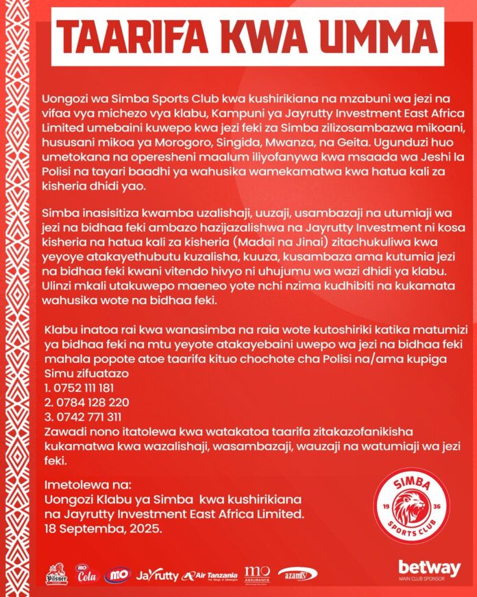 HomeKITAIFASIMBA YAHUJUMIWA KWA UUZAJI WA JEZI FEKI MIKOANI KITAIFA SIMBA YAHUJUMIWA KWA UUZAJI WA JEZI FEKI MIKOANI By Chikao September 18, 2025 0 717 Share FacebookTwitterPinterestWhatsApp TagsSimba SC Share FacebookTwitterPinterestWhatsApp Previous articleSINGIDA BS YAANZA MAZOEZI YA KWANZA KIGALI, RWANDANext articleHABARI KUBWA KATIKA MAGAZETI YA LEO SEPTEMBA I9, 2025 Chikaohttps://sokaleo.co.tz RELATED ARTICLES KITAIFA MANGUNGU: MABADILIKO YA BENCHI LA UFUNDI NDIO YALIIVURUGA SIMBA February 5, 2026 KITAIFA SALUM MAYANGA AKALIA KUTI KAVU MASHUJAA February 4, 2026 KITAIFA JAYRUTTY KUMSHUSHA MCHEZAJI GANI KWA WAKATI HUU?? January 11, 2026 LEAVE A REPLY Cancel reply Comment: Please enter your comment! Name:* Please enter your name here Email:* You have entered an incorrect email address! Please enter your email address here Website: Save my name, email, and website in this browser for the next time I comment. Most Popular MANGUNGU: MABADILIKO YA BENCHI LA UFUNDI NDIO YALIIVURUGA SIMBA February 5, 2026 SALUM MAYANGA AKALIA KUTI KAVU MASHUJAA February 4, 2026 BENCHIKHA NA CHE MALONE WANALITAKA KOMBE January 27, 2026 JAYRUTTY KUMSHUSHA MCHEZAJI GANI KWA WAKATI HUU?? January 11, 2026 Load more Recent Comments Chikao on Majina ya Usaili kusimamia uchaguzi 2025 – Tume ya uchaguzi Renatha on Majina ya Usaili kusimamia uchaguzi 2025 – Tume ya uchaguzi Renatha on Majina ya Usaili kusimamia uchaguzi 2025 – Tume ya uchaguzi Grace Werema on Majina ya Usaili kusimamia uchaguzi 2025 – Tume ya uchaguzi Goba jr on SERIKALI YATOA KAULI JUU YA SAKATA LA PAMBA JIJI KUFANYA MAZOEZI GIZANI Goba jr on MAYELE AANDIKA HISTORIA MPYA PYRAMID, BAADA YA KUIFUNGIA HAT-TRICK Goba jr on WAYNE ROONEY: SIMCHUKII RONALDO, LAKINI MESSI NI BORA Seif on Majina ya Waliochaguliwa Kusimamia Uchaguzi Temeke 2025 GAMRAJ on HIKI HAPA KIKOSI RASMI CHA SIMBA SC 2025/26 ALLY RAJABU ADAMU on Yanga SC vs Simba SC zimebaki siku tatu Wanted on STARS ICHEZE UWANJANI MASHABIKI WACHEZE JUKWAAMI yusters on PITIA MAGAZETI YA MICHEZO LEO TAREHE 21 AGOSTI 2025 Web Development Company in Kochi,Kerala on NEYMAR AMWAGA MACHOZI AKIKUTANA NA KIPIGO KIKUBWA ZAIDI KWAKE Agustino on NAMBA 8 MPYA WA YANGA SC LASSINE ANATAKA KUTEMBEZA 5G MAGAZETI YA MICHEZO LEO ALHAMISI TAREHE 24-7-2025 - SOKALEO on RASMI: YANGA YAMNASA CASEMIRO WA ZANZIBAR KUTOKA MLANDEGE! CV YA MOUSSA BALLA CONTE, MCHEZAJI MPYA WA YANGA SC 2025/2026 - SOKALEO on TETESI: KAPOMBE BADO YUPO SANA SIMBA, AMWAGA WINGO UPYA Stanley kitendya on TETESI ZA USAJILI SIMBA LEO 2025/26 Benard kayingo on FADLU DAVIDS ATAJA NI WACHEZAJI GANI WATABAKI SIMBA JELADI CHINDO on TETESI ZA USAJILI SIMBA LEO 2025/26 JELADI CHINDO on TETESI ZA USAJILI SIMBA LEO 2025/26 Paulo Kimonga on TETESI ZA USAJILI SIMBA LEO 2025/26 Yahaya kingaz omari on KAIZER CHEIF WAWEKA MZIGO KUMPATA AHOUA bangla Khobor Kolkata on TFF YATOA MAELEKEZO KWA WAGOMBEA WA UCHAGUZI MKUU 2025 muppu on YANGA YAIJIBU TFF, DAWA YA DENI NI KULIPA KWA WAKATI go now on BEKI WA KAZI SIMBA SC KAMILI KUWAKABILI RS BERKANE MEI 25 2025