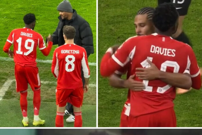 Alphonso Davies alipata shangwe kutoka kwa mashabiki wa Bayern Munich na kukumbatiwa na wachezaji wenzake baada ya kurejea kutoka kwa jeraha la ACL (anterior cruciate ligament) baada ya siku 262.